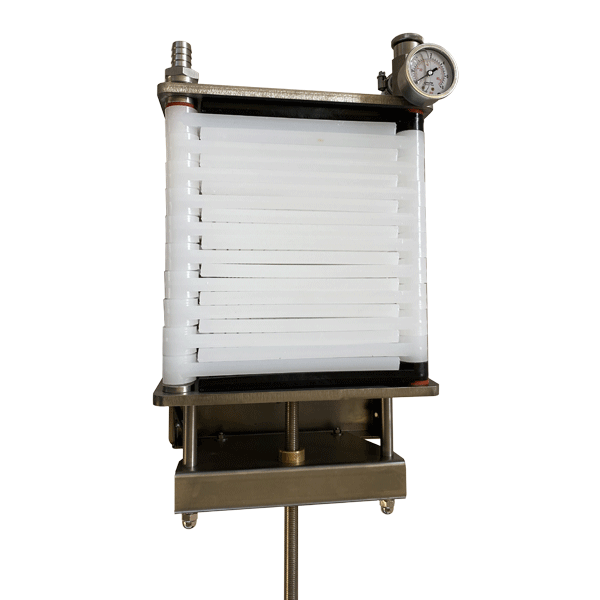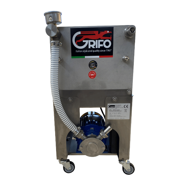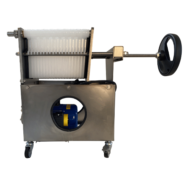 The pump and the structure are entirely made out of stainless-steel, which ensures high hygiene and durability; the plates for the filtering layers are made of linear nylon. This filter is designed for the use of 20 filtering layers, but it works with a lower amount, decreasing the hourly production. Equipped with a manometer for controlling the pressure and a valve for fluid control. The filter is easy to assemble and the layers are quickly replaced. Product waste is kept to a minimum.