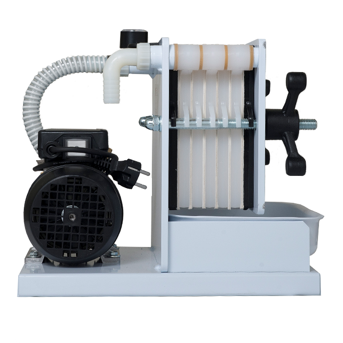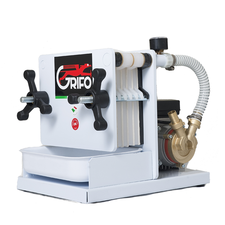 Part of the range for domestic use called “hobby”, but unique in its ability to filter extra-virgin olive oil. Practical and simple in its functioning, the FCH6-OLIO filter has an enameled steel structure, a stainless-steel pump and a rubber impeller. Equipped with linear nylon plates in which to place the filtering layers. It can work with up to 6 layers, but fewer layers result in a lower hourly production. The filter comes with a manometer for pressure control and a liquid recovery tank.