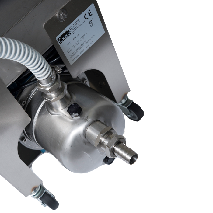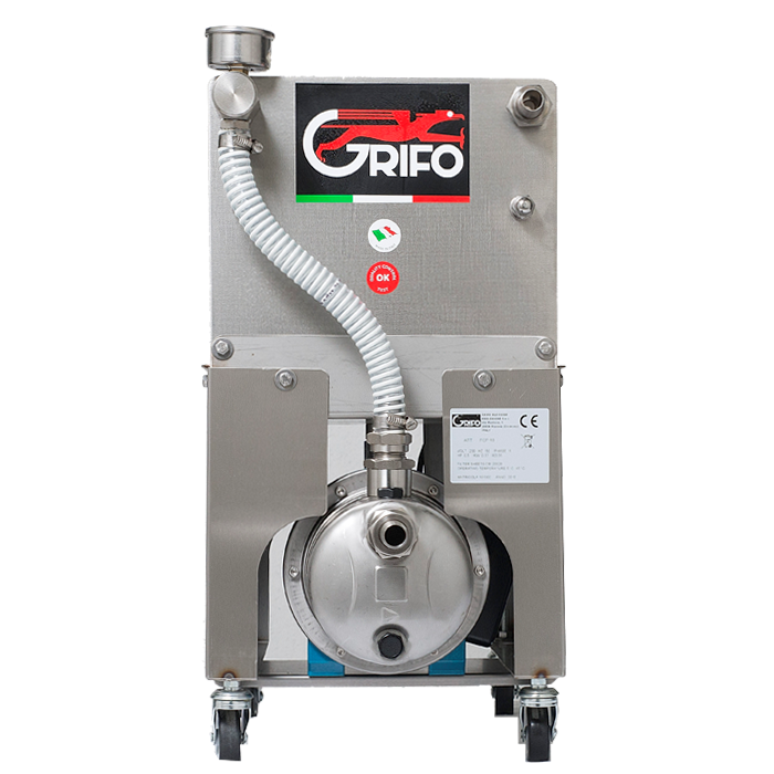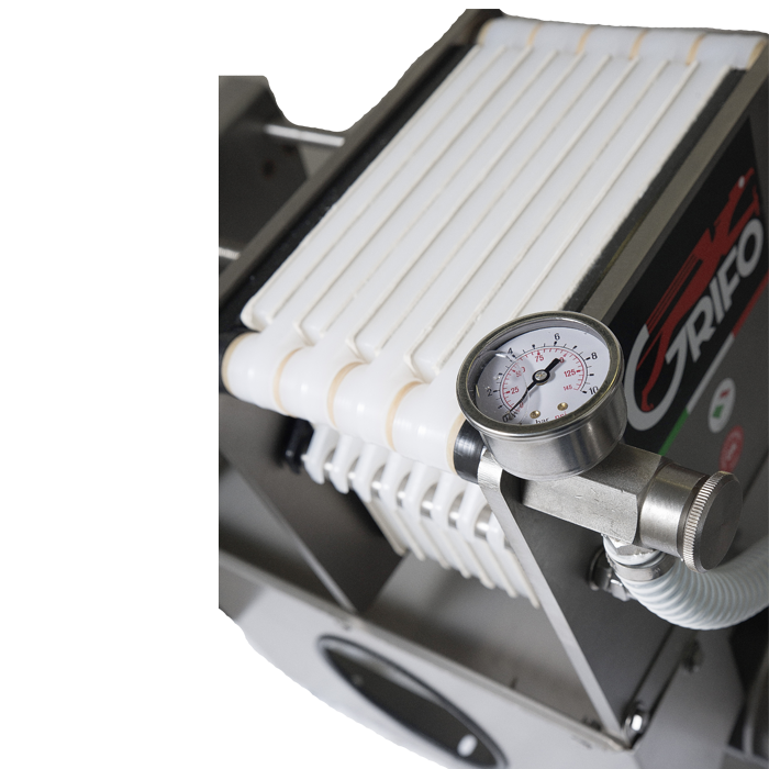 The pump and the structure are entirely made out of stainless-steel, which ensures high hygiene and durability; the plates for the filtering layers are made of linear nylon. This filter is designed for the use of 20 filtering layers, but it works with a lower amount, decreasing the hourly production. Equipped with a manometer for controlling the pressure and a valve for fluid control. The filter is easy to assemble and the layers are quickly replaced. Product waste is kept to a minimum.