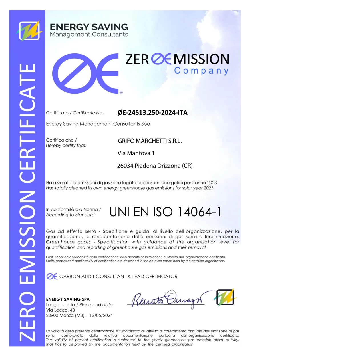 In 2022, after years of research and investment in technologies that combine innovation and sustainability, Grifo Marchetti of Piadena Drizzona obtained the “Zero EmissionCompany” certification, awarded to companies that use energy obtained from renewable sources. Certification is awarded according to three criteria:[/vc_column_text][/vc_column][/vc_row][vc_row][vc_column][vc_raw_html]JTNDdGFibGUlMjAlM0UlMEElMjAlMjAlMjAlMjAlMjAlMjAlMjAlMjAlM0N0Ym9keSUzRSUwQSUyMCUyMCUyMCUyMCUyMCUyMCUyMCUyMCUyMCUyMCUyMCUyMCUzQ3RyJTNFJTBBJTIwJTIwJTIwJTIwJTIwJTIwJTIwJTIwJTIwJTIwJTIwJTIwJTIwJTIwJTIwJTIwJTNDdGQlMjBjbGFzcyUzRCUyMmNsYXNzZS1udW1lcmklMjIlM0UxLSUzQyUyRnRkJTNFJTBBJTIwJTIwJTIwJTIwJTIwJTIwJTIwJTIwJTIwJTIwJTIwJTIwJTIwJTIwJTIwJTIwJTNDdGQlM0UlMEElMjAlMjAlMjAlMjAlMjAlMjAlMjAlMjAlMjAlMjAlMjAlMjAlMjAlMjAlMjAlMjAlMjAlMjAlMjAlMjAlM0NwJTNFQ2FyYm9uJTIwRm9vdHByaW50JTJDJTIwYSUyMHBhcmFtZXRlciUyMHRoYXQlMjBnb2VzJTIwdG8lMjBjYWxjdWxhdGUlMjB0aGUlMjBlbnZpcm9ubWVudGFsJTIwaW1wYWN0JTIwYnklMjBlc3RpbWF0aW5nJTIwZ3JlZW5ob3VzZSUyMGdhcyUyMGVtaXNzaW9ucyUyMGluJTIwdG9ucyUyMGR1cmluZyUyMHRoZSUyMHByb2R1Y3Rpb24lMjBjeWNsZSUyMG9mJTIwYSUyMGNvbXBhbnklM0IlM0MlMkZwJTNFJTBBJTIwJTIwJTIwJTIwJTIwJTIwJTIwJTIwJTIwJTIwJTIwJTIwJTIwJTIwJTIwJTIwJTNDJTJGdGQlM0UlMEElMjAlMjAlMjAlMjAlMjAlMjAlMjAlMjAlMjAlMjAlMEElMjAlMjAlMjAlMjAlMjAlMjAlMjAlMjAlMjAlMjAlMEElMjAlMjAlMjAlMjAlMjAlMjAlMjAlMjAlMjAlMjAlMjAlMjAlMjAlMjAlMjAlMjAlM0N0ZCUyMGNsYXNzJTNEJTIyY2xhc3NlLW51bWVyaSUyMiUzRTItJTNDJTJGdGQlM0UlMEElMjAlMjAlMjAlMjAlMjAlMjAlMjAlMjAlMjAlMjAlMjAlMjAlMjAlMjAlMjAlMjAlM0N0ZCUzRSUwQSUyMCUyMCUyMCUyMCUyMCUyMCUyMCUyMCUyMCUyMCUyMCUyMCUyMCUyMCUyMCUyMCUyMCUyMCUyMCUyMCUzQ3AlM0VDYXJib24lMjBPZmZzZXQlMjBhbmQlMjBDb21wZW5zYXRpb24lMkMlMjB6ZXJvaW5nJTIwb2YlMjB0aGUlMjBxdWFudGl0aWVzJTIwb2YlMjBncmVlbmhvdXNlJTIwZ2FzZXMlMjBwcm9kdWNlZCUyMHRocm91Z2glMjBlbnZpcm9ubWVudGFsJTIwY29tcGVuc2F0aW9uJTIwYWN0aXZpdGllcyUyMCUyOGVuZXJneSUyMHVzZSUyQyUyMHRlY2hub2xvZ2ljYWwlMjBlZmZpY2llbmN5JTJDJTIwcmVmb3Jlc3RhdGlvbiUyOSUzQiUzQyUyRnAlM0UlMEElMjAlMjAlMjAlMjAlMjAlMjAlMjAlMjAlMjAlMjAlMjAlMjAlMjAlMjAlMjAlMjAlM0MlMkZ0ZCUzRSUwQSUyMCUyMCUyMCUyMCUyMCUyMCUyMCUyMCUyMCUyMCUyMCUwQSUyMCUyMCUyMCUyMCUyMCUyMCUyMCUyMCUyMCUyMCUyMCUyMCUwQSUyMCUyMCUyMCUyMCUyMCUyMCUyMCUyMCUyMCUyMCUyMCUyMCUyMCUyMCUyMCUyMCUzQ3RkJTIwY2xhc3MlM0QlMjJjbGFzc2UtbnVtZXJpJTIyJTNFMy0lM0MlMkZ0ZCUzRSUwQSUyMCUyMCUyMCUyMCUyMCUyMCUyMCUyMCUyMCUyMCUyMCUyMCUyMCUyMCUyMCUyMCUzQ3RkJTNFJTBBJTIwJTIwJTIwJTIwJTIwJTIwJTIwJTIwJTIwJTIwJTIwJTIwJTIwJTIwJTIwJTIwJTIwJTIwJTIwJTIwJTNDcCUzRVplcm8lMjBFbWlzc2lvbiUyQyUyMHByb29mJTIwb2YlMjB6ZXJvJTIwZ3JlZW5ob3VzZSUyMGdhcyUyMGVtaXNzaW9ucyUyMGZyb20lMjBkYWlseSUyMGFjdGl2aXRpZXMlMjByZWxhdGVkJTIwdG8lMjBlbmVyZ3klMkMlMjBnYXMlMjBhbmQlMjB0cmFuc3BvcnQlMjBjb25zdW1wdGlvbiUzQiUzQyUyRnAlM0UlMEElMjAlMjAlMjAlMjAlMjAlMjAlMjAlMjAlMjAlMjAlMjAlMjAlMjAlMjAlMjAlMjAlM0MlMkZ0ZCUzRSUwQSUyMCUyMCUyMCUyMCUyMCUyMCUyMCUyMCUyMCUyMCUyMCUyMCUzQyUyRnRyJTNFJTBBJTIwJTIwJTIwJTIwJTIwJTIwJTIwJTIwJTNDJTJGdGJvZHklM0UlMEElMjAlMjAlMjAlMjAlM0MlMkZ0YWJsZSUzRSUwQSUwQQ==[/vc_raw_html][/vc_column][/vc_row][vc_row css=”.vc_custom_1710846841145{margin-top: 20px !important;margin-bottom: 20px !important;}”][vc_column width=”1/2″][vc_column_text]